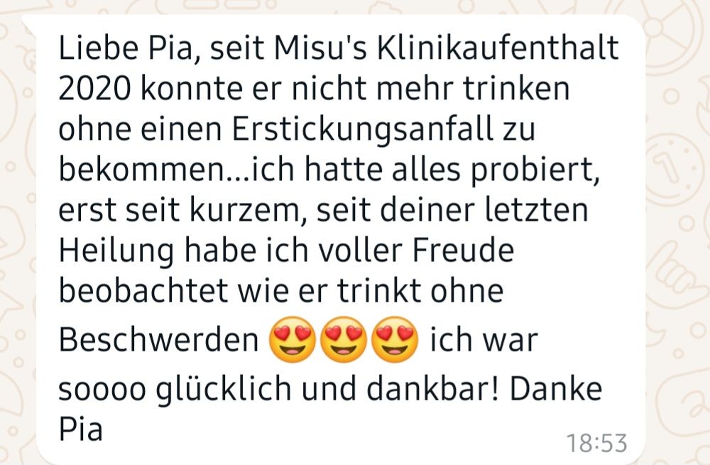Diese Woche, also drei Monate nach der Extraktion, meldete sich Misu´s Besitzerin wieder. Misu zeigt ein hängendes Ohr und häufiges Kopfschütteln. In einer Extraktion zeigten sich auch diesmal krankmachende Energien im Bereich des rechten Vorderbeins und im Kinn/ Halsbereich. Die körperlichen Beschwerden waren aber ganz andere. Die Energien wurden extrahiert und noch am selben Tag erreichte mich abends die Information, dass Misu keine Auffälligkeit mehr zeigt.